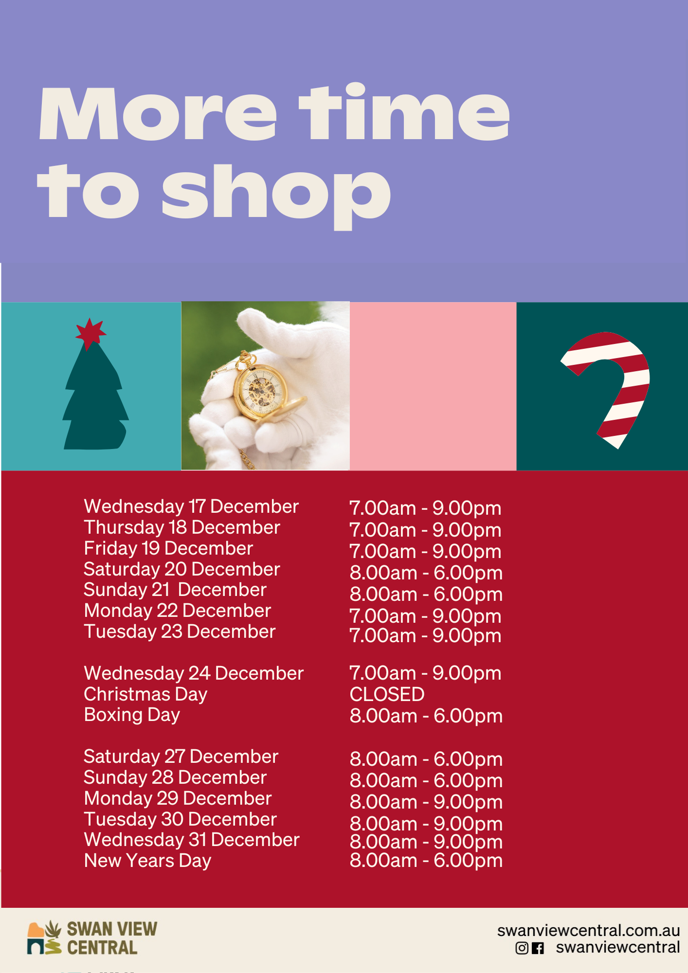 This festive season, we’re giving you the gift of time. With extended trading hours at Swan View Central, you can shop at your own pace.